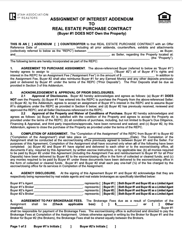 Two primary real estate contracts are used to wholesale real estate in Utah. Those include: